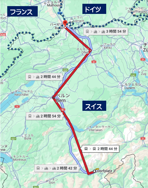 かなりの距離がありますが、ブリーグからインターシティーやユーロシティーの特急列車に乗ると片道3時間程度で行くことができます。