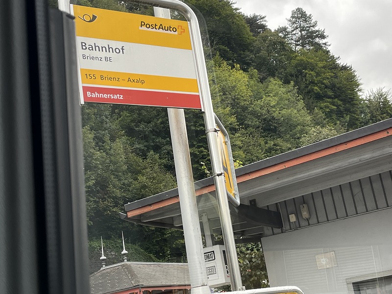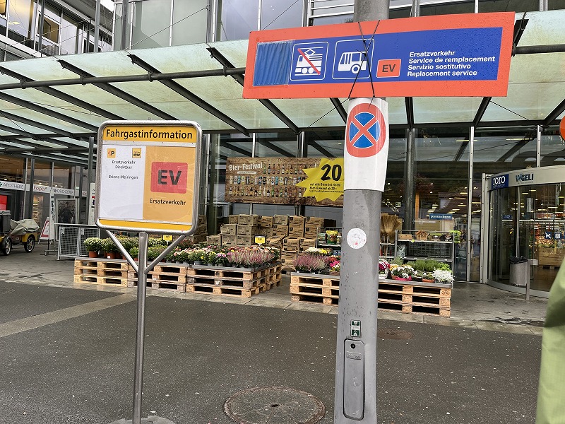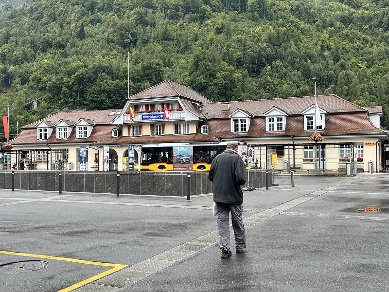 9:09 インターラーケンオスト駅前のマイリンゲン行バス停です。ここに待っていたら目の前をマイリンゲン行のバスが止まらずに通過していきました。予定の時刻にです。後で近くの人に聞いてわかったのですが、マイリンゲン行の停留所はここでなく別の場所にいどうしてたみたいです。焦りました。少し時間に余裕を持たせていたので何とかなりました。