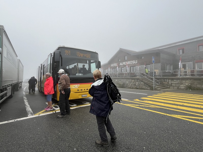 ここで待てと。そして今日はグリムゼル峠は天気が悪いからマイリンゲンからのバスは運行していないかもしれない、わからないと言いました。