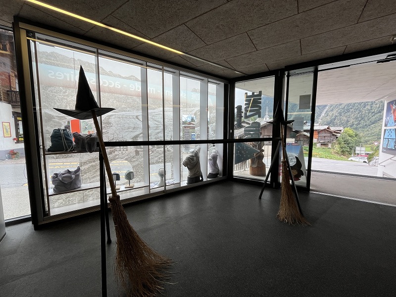 魔女スキーの前夜は、魔女のダンスがお決まりの儀式。スイスや南ドイツが発祥の、カーニバルなどでおなじみの“グッゲンムズィークGuggenmusik”という独特の激しいリズムの音楽にあわせて 炎の周りを踊ります。そんな魔女伝説を受けて、ほうきや帽子を飾った建物がありました。