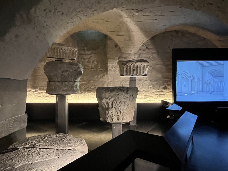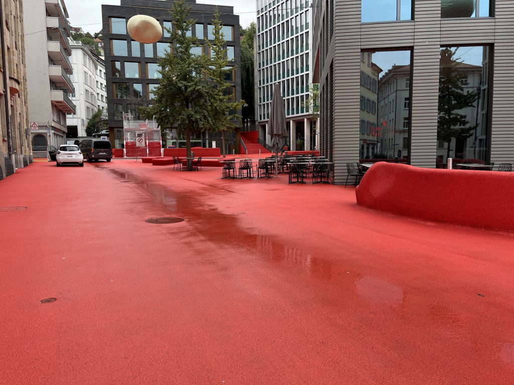 駅と修道院のちょうど中間あたり、辺り一面がレッドカーペットで覆われたように見えますが、コンクリートで固められています。この日は人通りがありませんでしたが、椅子や固いソファーに座った写真がありましたので休日などはくつろげる場所になるのかもしれません。