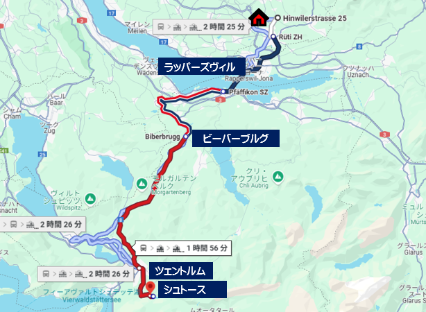 麓駅のシュラットリへの行き方を見るとほとんどがシュビーツからのコースで案内してありますが、私たちはシュピーツを通らないのでビーバーブルグからバスを2回乗り継いでいきました。