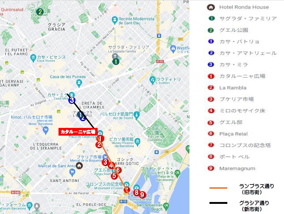 カタルーニャ広場から、目的のカサ・バトリョを通り越して通りの最後、これもガウディ建築のカサ・ミラ(青の③)まで歩いてみました。