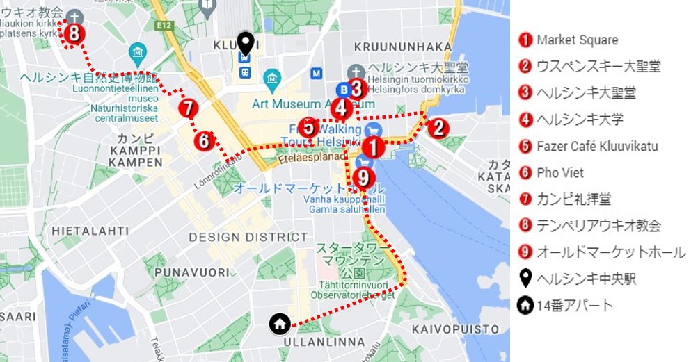 ヘルシンキは首都でありながらとてもコンパクトな街なので、多くの観光名所が中心地から歩いていける範囲にあります。前日、船から降りて17:00頃に24時間有効の一日乗車券を買ったので、トラムもバスも乗り放題だったのですが、結局、交通機関はほとんど使わずに徒歩で街歩きを楽しみました。