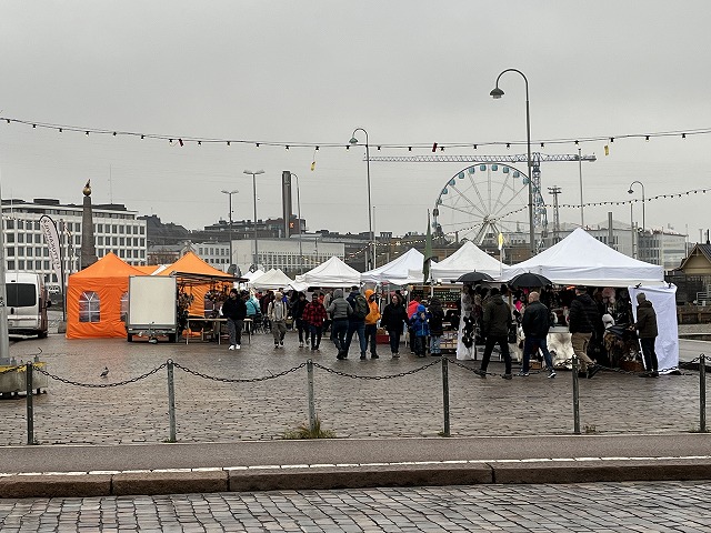ヘルシンキ大聖堂からほど近いベイサイドエリアで開催されている青空市場です。朝食におすすめということで朝一番のコースに入れましたが、あいにくの天気でテントも少なめでした。扱っているものによってテントの色が異なり、食べ物のお店はオレンジ色のテント、クラフト品のお店は白となっているそうです。