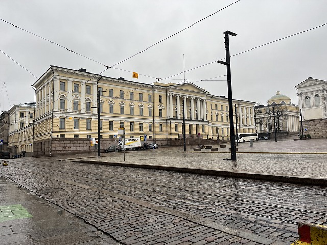 ヘルシンキ元老院広場に面して立っています。奥にはフィンランド国立図書館が見えています。左上方からは大聖堂が見守っています。