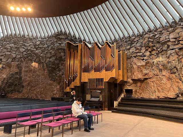 円盤(ドーム)状の屋根は数百キロの銅でできているそうです。フィンランドの主要鉱産物は銅が最も多く、テンペリアウキオ教会はフィンランドのデザイン力と大量の銅という国力が結集してできた建物だそうです。
