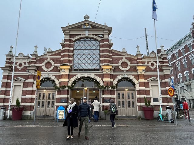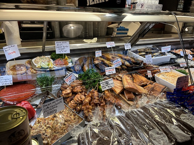 洞窟教会からはトラムに乗って①番で訪れた港の傍のマーケットスクエアにある屋内マーケットに向かいました。マーケットの中にはカフェのほか、魚、肉、パン、野菜、チーズ、お酒などを扱う店が入っていて、フィンランドらしいバラエティー豊かな食材が見つかります。