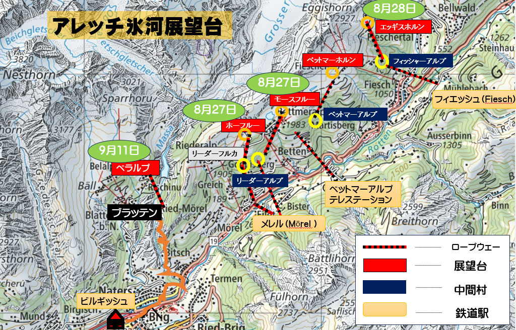 ビューポイントは氷河の流れに沿って上流から、エッギスホルン展望台 Eggishorn (2869m)、ベットマーホルン展望台 Bettmerhorn (2647m)、モースフルー展望台 Moosfluh (2333m)、ホーフルー展望台 Hohfluh (2227m)の4つの展望台と末端から谷をまたいでベラルプ展望台があります。