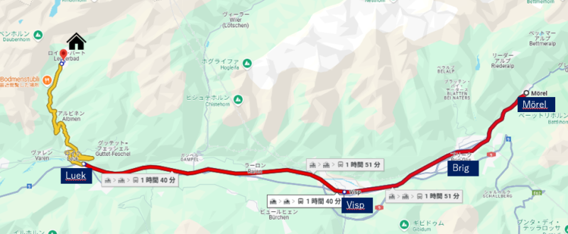 ロイカバートのアパートそば3分のバス停「Leukerbad. Briggu」から麓の鉄道駅「Leuk」までバスで約30分この間のバスの連絡は往復ともに1時間に2本、時間は正確なのでほとんどストレスなく毎日利用できました。