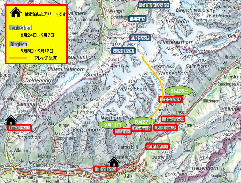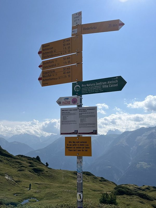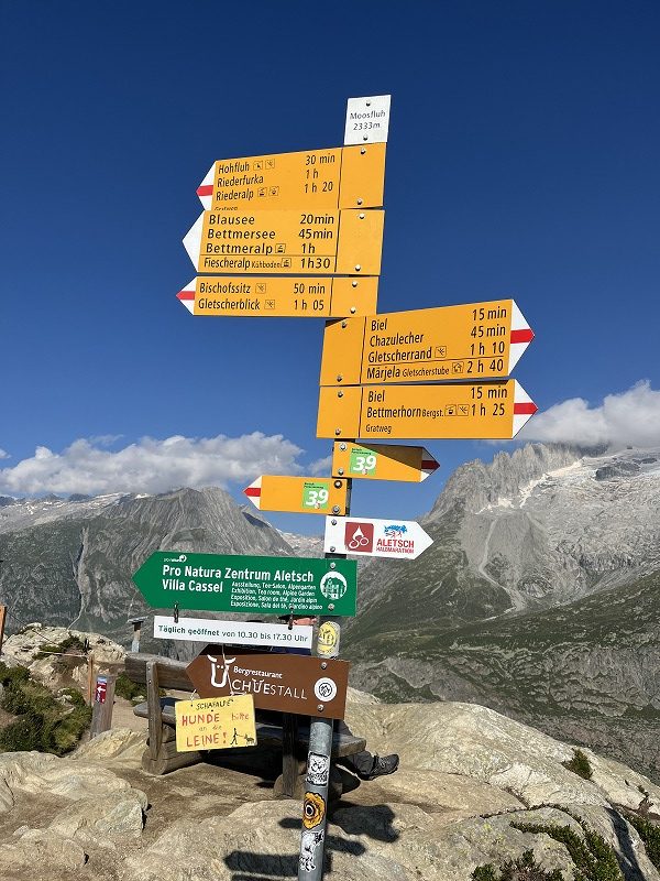 第一日目はメレル駅からリーダーアルプを経由してモースフルーに上がり、そこからホーフルー展望台を経由して氷河を見ながらのハイキングを楽しみます。
