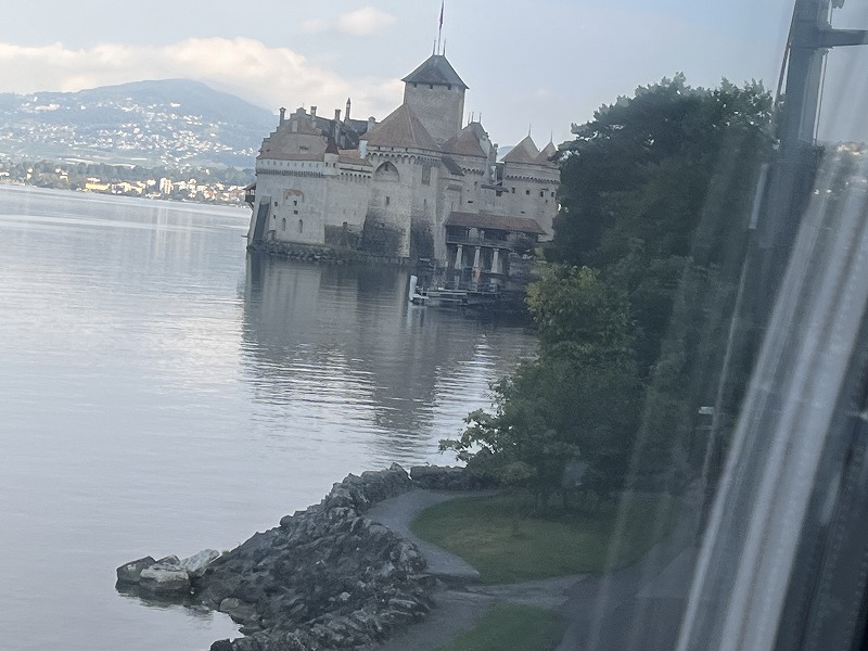 9:13 ロイクから列車に乗って1時間30分ほど経ちました。湖に浮かぶ「囚人の城」シヨン城です。前にモントルーから湖に沿った遊歩道を歩いて訪れました。今回はスルーです。