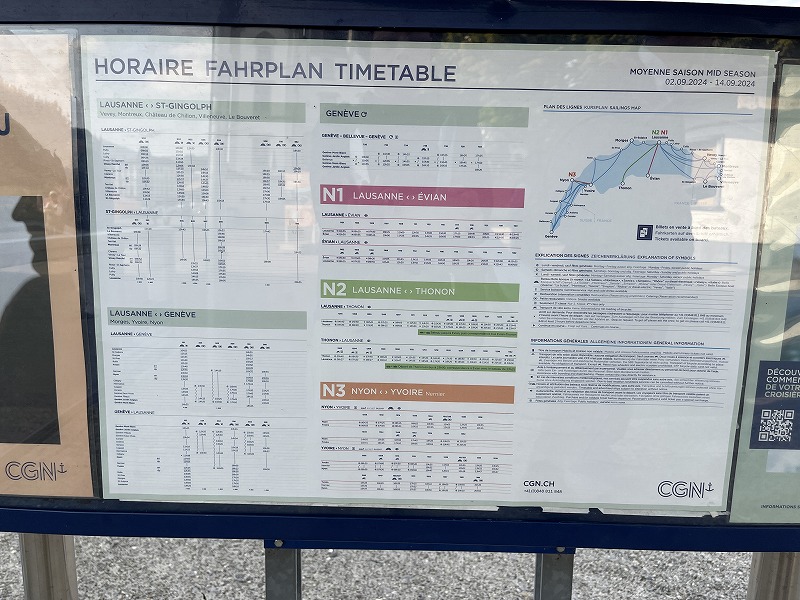 9:48 歩いているとフェリーが到着するのが見えました。どこに行くのかと近くにあった掲示板を除くと、なんと私たちが午後から乗ろうとしているローザンヌ行が、9:52着、9:55発で表示されていました。この経路は一日に2便しかないのです。全くのラッキー!大急ぎで桟橋に向かいました。
