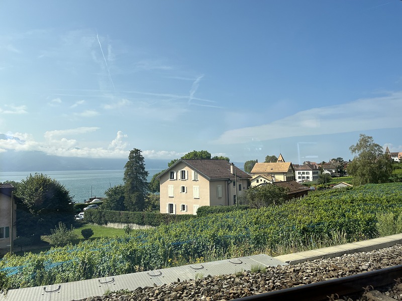 11:18 ローザンヌからヴヴェイまでは14分、進行方向の右方向にレマン湖を望みながら線路に沿って続く牧歌的な風景が何とも癒されます。