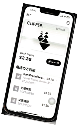 日本のSuicaのようなカードのClipperカード。サンフランシスコのベイエリアのすべての交通機関で利用でき、毎回の乗車券の購入が不要になります。
